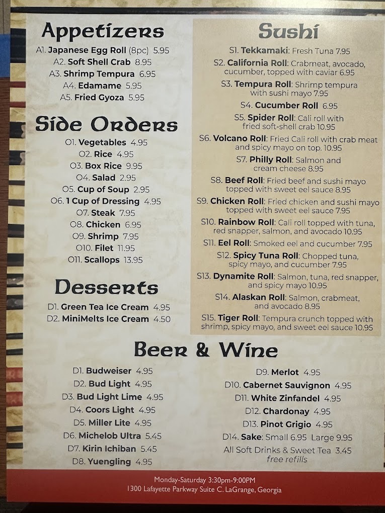 For those looking to unwind, the drink menu features well-known beers alongside a curated list of wines, from crisp Pinot Grigio to rich Cabernet Sauvignon, creating an easygoing pairing for any meal. Light bites like fried gyoza and traditional sushi rolls offer a nice balance when you want something simple or to share.
